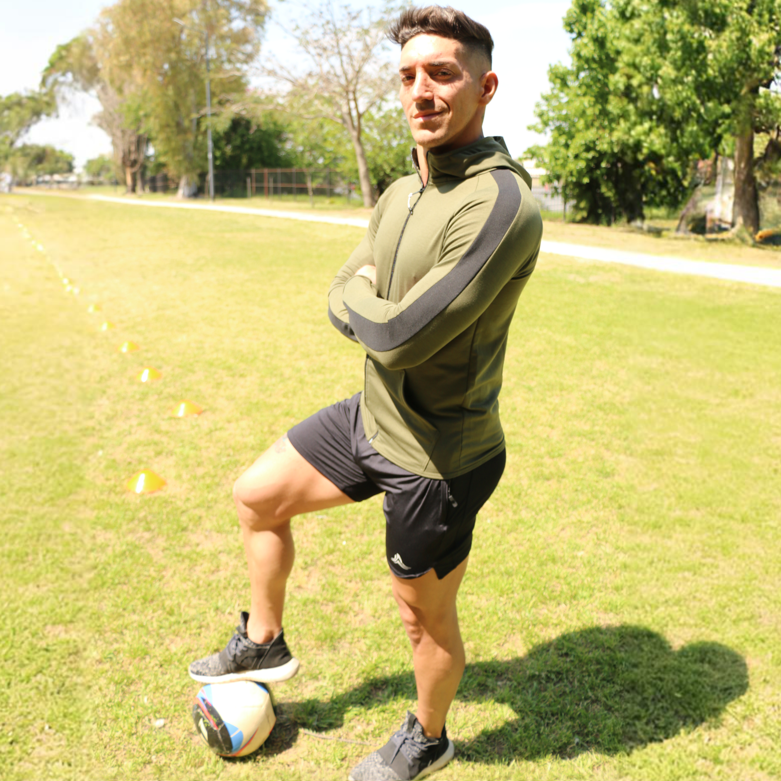 Campera deportiva de hombre, algodón y cierre delantero, verde con líneas negras en las mangas y capucha.