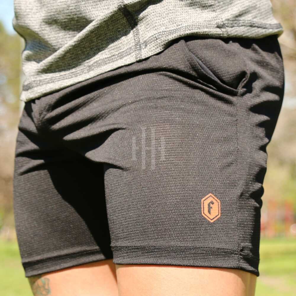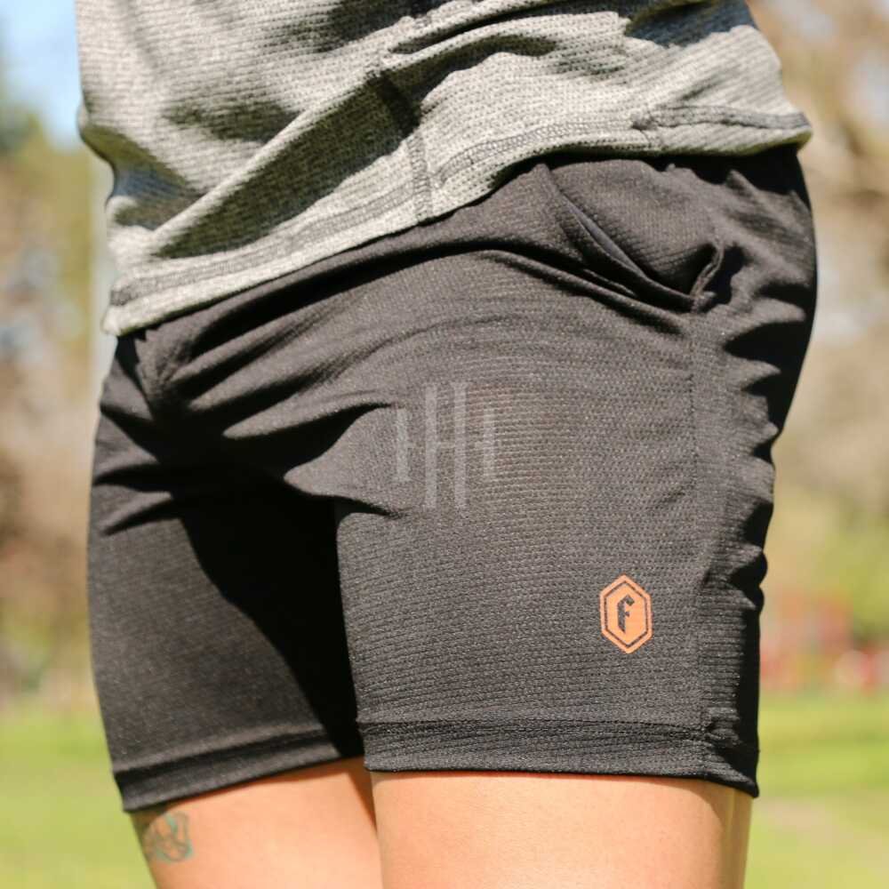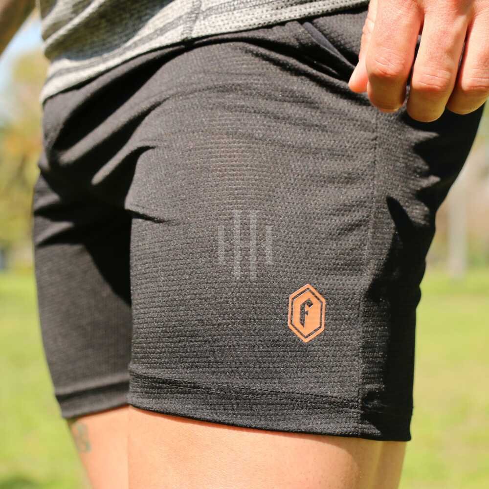 Short negro, logo gris, con cierre. Crossray